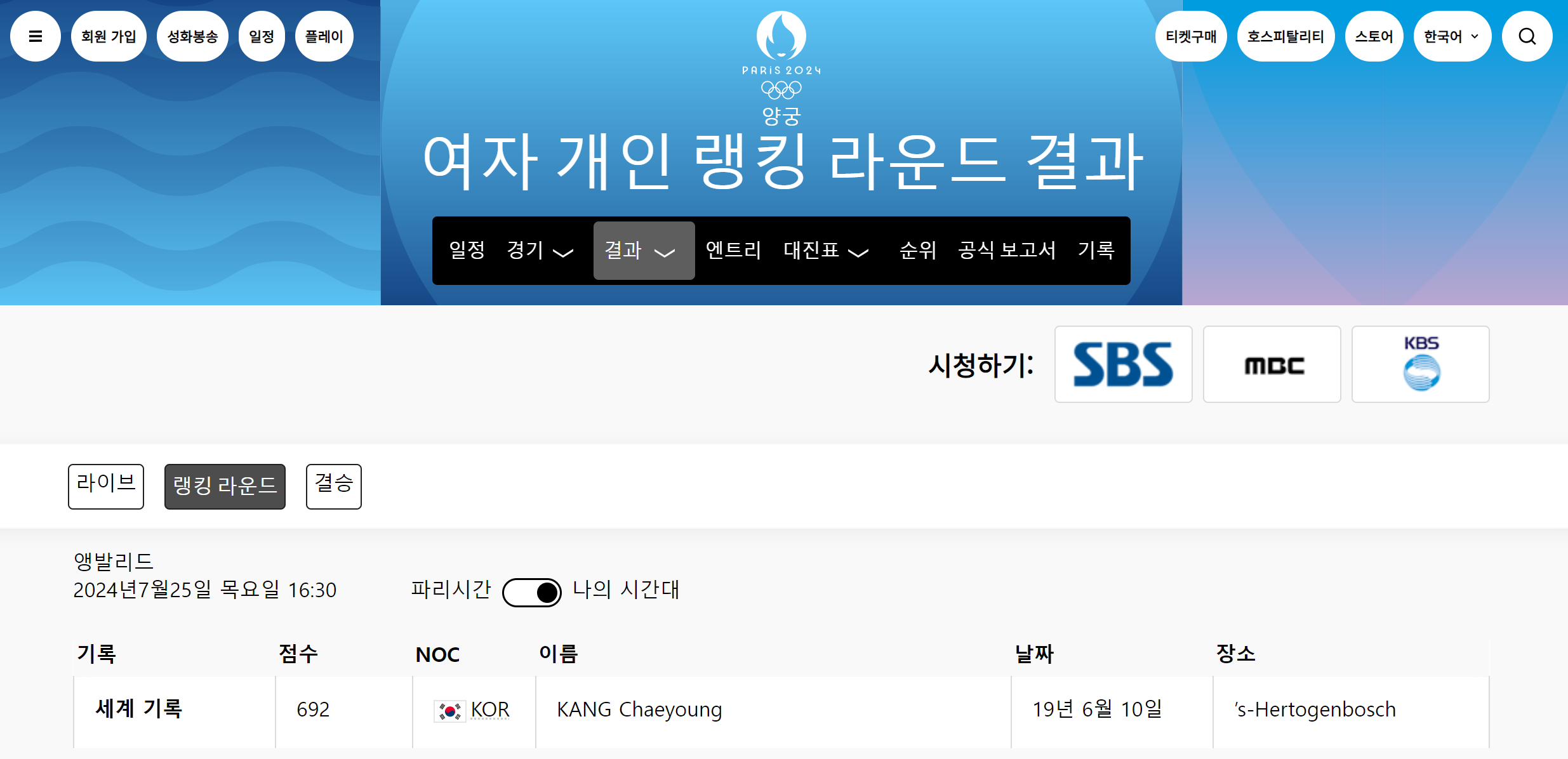 4. 공식 파리올림픽 홈페이지 실시간 라이브 중계 결과